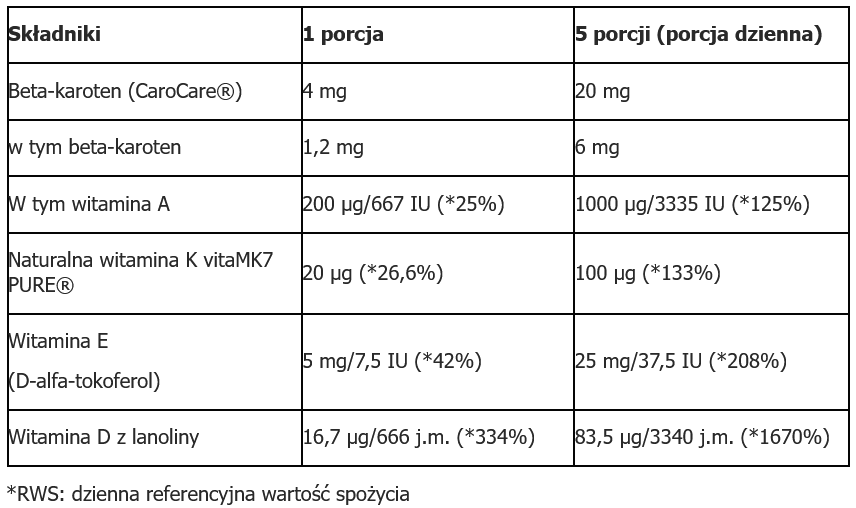 Oliwa z oliwek Extra Virgin z pierwszego tłoczenia, naturalna witamina E (D-alfa-tokoferol). naturalny beta-karoten CaroCare® powstający z fermentacji Blakeslea trispora, naturalna witamina K (menachinon-7) w opatentowanej postaci vitaMK7 PURE®, naturalna witamina D z lanoliny (cholekalcyferol).