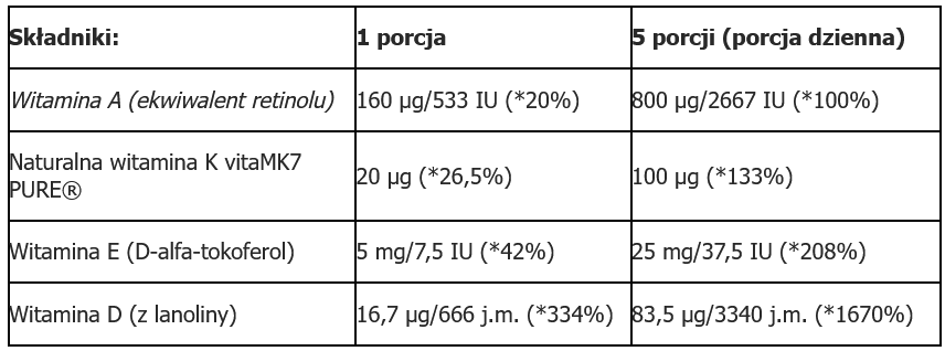 Oliwa z oliwek Extra Virgin z pierwszego tłoczenia, naturalna witamina E (D-alfa-tokoferol). witamina A (palmitynian retinylu), naturalna witamina K (menachinon-7) w opatentowanej postaci vitaMK7 PURE®, naturalna witamina D z lanoliny (cholekalcyferol).