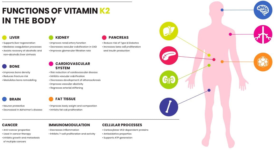 Witamina K2 to mało znana i niedoceniana witamina o potężnym potencjale prozdrowotnym. Najnowsze badania naukowe wykazują niezbicie, że rola witaminy K2 w organizmie wykracza daleko poza wpływ na krzepnięcie krwi. Pomaga ona bowiem w ochronie organizmu przed chorobami serca, zapobiega powstawaniu nowotworów, wspiera tworzenie mocnych kości, wspomaga funkcje mózgu, pomaga w rozwoju i wzroście tkanek, oraz dobrze wpływa na zdrowie skóry.
