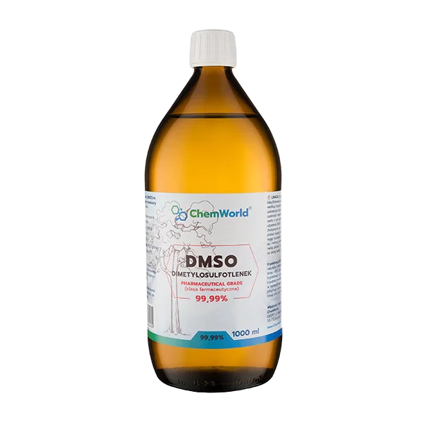 DMSO 99,99% marki Chem World. DMSO (Dimetylosulfotlenek) to organiczny związek z grupy sulfotlenków. Jest naturalną substancją pochodzącą z miazgi drzewnej. DMSO za pośrednictwem tlenu przekształcany jest w MSM (siarka organiczna). DMSO marki Chem World to jedyny na rynku tego typu produkt, o potwierdzonej badaniami, bardzo wysokiej farmaceutycznej klasie czystości min. 99.999% (klasa wyższa od CZDA). DMSO o tak wysokiej czystości jest niemal bezwonne. Produkt naturalny, wyprodukowany w duchu tzw. czystej etykiety (eng. clean label), nie zawierający wypełniaczy, ani żadnych syntetycznych środków barwiących, smakowych i konserwujących. Jakość Premium!