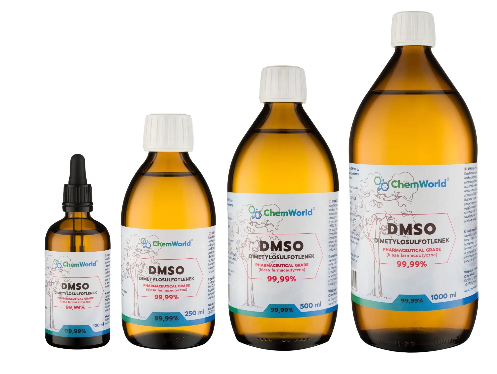 DMSO 99,99% marki Chem World. DMSO (Dimetylosulfotlenek) to organiczny związek z grupy sulfotlenków. Jest naturalną substancją pochodzącą z miazgi drzewnej. DMSO za pośrednictwem tlenu przekształcany jest w MSM (siarka organiczna). DMSO marki Chem World to jedyny na rynku tego typu produkt, o potwierdzonej badaniami, bardzo wysokiej farmaceutycznej klasie czystości min. 99.999% (klasa wyższa od CZDA). DMSO o tak wysokiej czystości jest niemal bezwonne. Produkt naturalny, wyprodukowany w duchu tzw. czystej etykiety (eng. clean label), nie zawierający wypełniaczy, ani żadnych syntetycznych środków barwiących, smakowych i konserwujących. Jakość Premium!