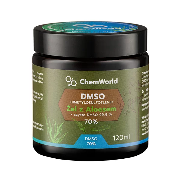 DMSO Żel 70% z aloesem marki Chem World. Żel DMSO o mocy 50% to połączenie najczystszego DMSO Pharmaceutical Grade 99,99% z najczystszym Aloesem meksykańskim 99%. Połączenie to tworzy krystaliczną formę żelu, tak aby można było z niego wygodniej korzystać. Jest to produkt naturalny, bardzo dobrze wchłanialny, dodatkowo wspomagany Aloesem. DSMO w postaci żelu to skuteczny naturalny środek wykazujący szybkie działanie przeciwbólowe oraz lecznicze. ALOES z kolei rewelacyjnie nawilża skórę (co jest wyjątkowo korzystne, ponieważ samo DMSO ją wysusza), a dodatkowo dostarcza tlen do jej komórek. Produkt naturalny, wyprodukowany w duchu tzw. czystej etykiety (eng. clean label), nie zawierający żadnych syntetycznych środków barwiących, smakowych i konserwujących. Jakość Premium!
