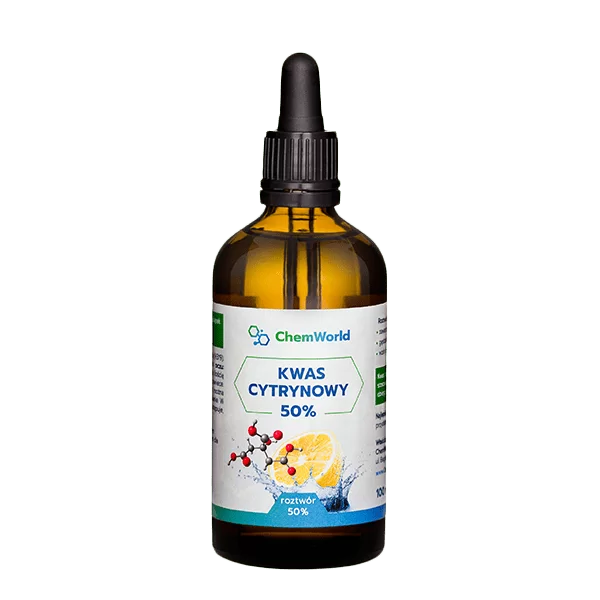 Kwas Cytrynowy Roztwór 50% marki Chem World. Wysokiej czystości kwas cytrynowy polecany jako aktywator MMS (Miracle Mineral Supplement), który może być wykorzystywany również jako przeciwutleniacz, a także kwasowy środek myjący. Ponadto, kwas cytrynowy doskonale sprawdzi się jako odkamieniacz w procesach czyszczenia armatury sanitarnej, czajników, piecyków, pralki itp. Roztwór kwasu cytrynowego zamknięty został w butelce z ciemnego szkła z pipetą, która pozwala na łatwy i bezpieczny sposób aplikacji. Produkt naturalny, wyprodukowany w duchu tzw. czystej etykiety (eng. clean label), nie zawierający żadnych syntetycznych środków barwiących, smakowych