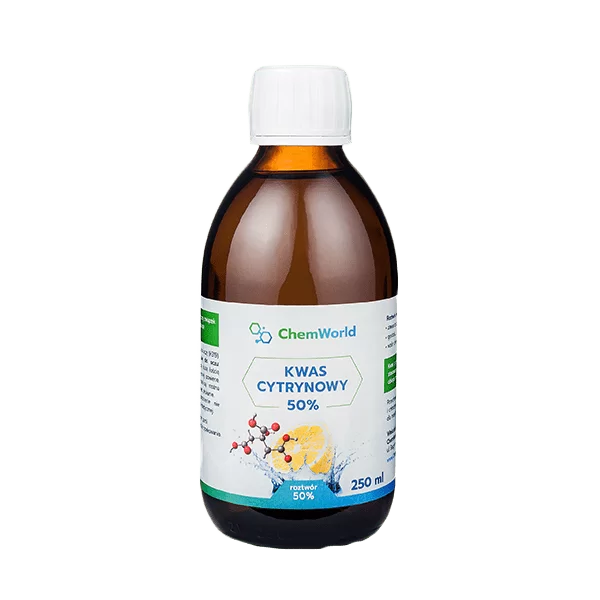 Kwas Cytrynowy Roztwór 50% marki Chem World. Wysokiej czystości kwas cytrynowy polecany jako aktywator MMS (Miracle Mineral Supplement), który może być wykorzystywany również jako przeciwutleniacz, a także kwasowy środek myjący. Ponadto, kwas cytrynowy doskonale sprawdzi się jako odkamieniacz w procesach czyszczenia armatury sanitarnej, czajników, piecyków, pralki itp. Roztwór kwasu cytrynowego zamknięty został w butelce z ciemnego szkła z pipetą, która pozwala na łatwy i bezpieczny sposób aplikacji. Produkt naturalny, wyprodukowany w duchu tzw. czystej etykiety (eng. clean label), nie zawierający żadnych syntetycznych środków barwiących, smakowych.