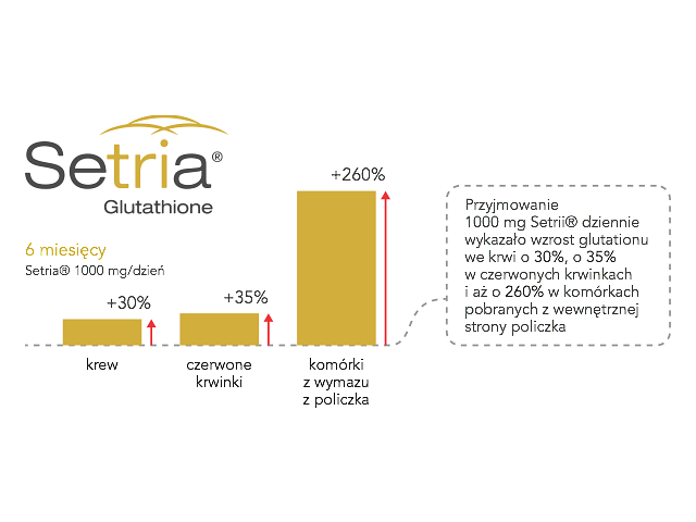 Glutation Setria® (Set - balance + Tria - tripeptide) to ultra czysty a zarazem ultra silny tripeptyd, wytwarzany w Japonii w zastrzeżonym procesie fermentacji. Ten unikalny proces wytwarzania daje możliwość pozyskiwania tzw. zredukowanej czyli aktywnej biologicznie formy glutationu o ponadprzeciętnej biodostępności, co potwierdziły liczne badania kliniczne. Tym samym Glutathione Setria® stanowi skuteczny sposób na zwiększenie poziomu glutationu w organizmie.