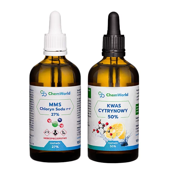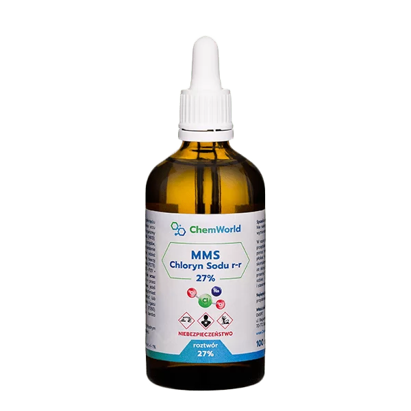 MMS Roztwór 27% marki Chem World. MMS (Miracle Mineral Supplement) to 27% roztwór chloranu sodu, zamknięty w buteleczce z ciemnego szkła z pipetą (w opakowaniu 100ml) która umożliwia łatwe i bezpieczne dozowanie produktu. Ta wyjątkowa w swym rodzaju mineralna substancja posiada bardzo silne właściwości antywirusowe, przeciwbakteryjne, przeciwgrzybiczne i przeciwpasożytnicze. Produkt naturalny, wyprodukowany w duchu tzw. czystej etykiety (eng. clean label), nie zawierający żadnych syntetycznych środków barwiących, smakowych i konserwujących. Jakość Premium!