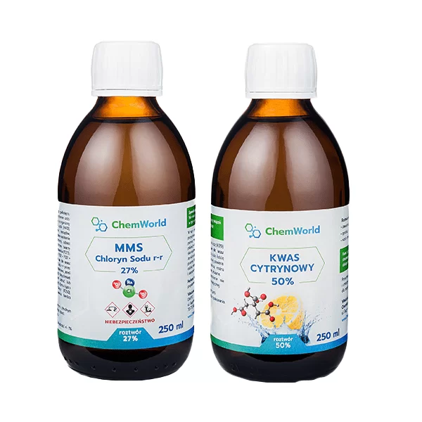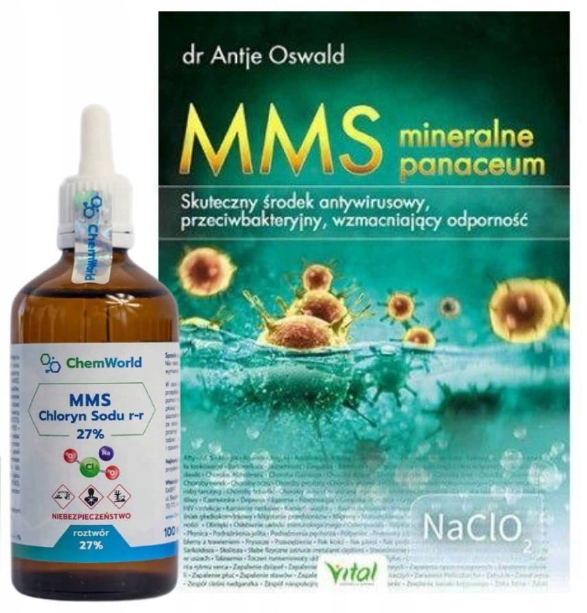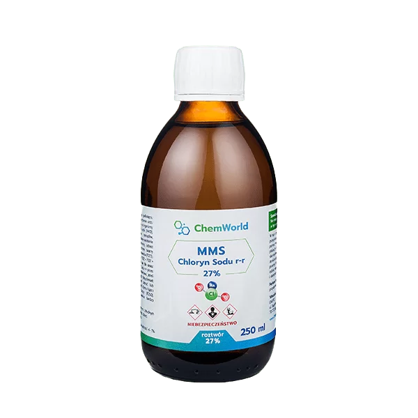MMS Roztwór 27% marki Chem World. MMS (Miracle Mineral Supplement) to 27% roztwór chloranu sodu, zamknięty w buteleczce z ciemnego szkła z pipetą (w opakowaniu 100ml) która umożliwia łatwe i bezpieczne dozowanie produktu. Ta wyjątkowa w swym rodzaju mineralna substancja posiada bardzo silne właściwości antywirusowe, przeciwbakteryjne, przeciwgrzybiczne i przeciwpasożytnicze. Produkt naturalny, wyprodukowany w duchu tzw. czystej etykiety (eng. clean label), nie zawierający żadnych syntetycznych środków barwiących, smakowych i konserwujących. Jakość Premium!