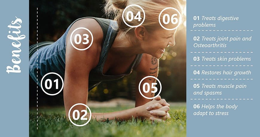 MSM jest stosowany jako popularny suplement w leczeniu stawów. Organizm ludzki wykorzystuje go do produkcji enzymów, przeciwciał, tkanki łącznej, glutationu oraz kolagenu wpływając bardzo korzystnie na elastyczność skóry, na budowę mięśni, na ścięgna, chrząstki, włosy i paznokcie. Siarka sprawuje ważną rolę w procesie budowy i funkcjonowania tkanki chrzęstno-stawowej, skutecznie poprawiając ruchomość, wytrzymałość i sprawność stawów.