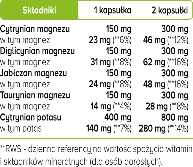 Cytrynian magnezu, diglicynian magnezu, jabłczan magnezu, taurynian magnezu, cytrynian potasu, otoczka kapsułki: hydroksypropylometyloceluloza.