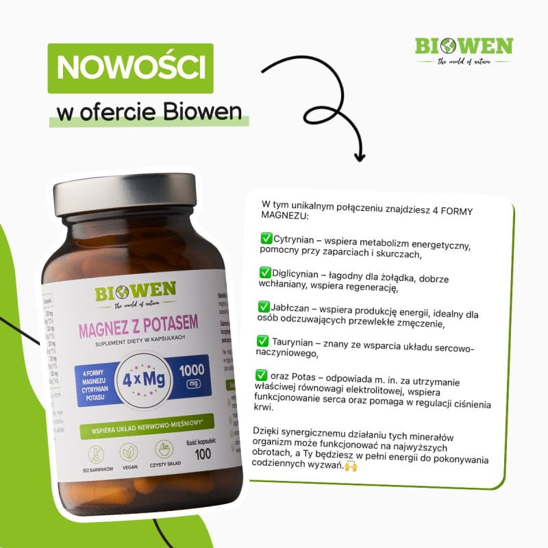 Wybierając magnez z potasem, warto zwrócić uwagę na kilka aspektów. Najlepiej przyswajalne formy magnezu i potasu to związki organiczne, takie jak cytrynian, diglicynian, jabłczan i taurynian magnezu oraz cytrynian potasu – dokładnie te, które znajdziesz w suplemencie Biowen. Równie ważny jest czysty skład, wolny od sztucznych wypełniaczy, konserwantów i zbędnych dodatków. Dodatkowym atutem jest ekologiczne opakowanie – Biowen dba o jakość swoich produktów, przechowując kapsułki w szklanym słoiku, który chroni je przed wilgocią i utrzymuje ich świeżość. Wybierając suplementy, warto sięgać po te, które łączą wysoką skuteczność, naturalność i bezpieczeństwo.
