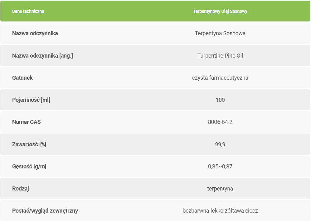 Terpentyna Sosnowa (czystość farmaceutyczna 99,9%, naturalna, pozyskiwana z żywicy kory Sosny Massona w procesie profesjonalnej destylacji).